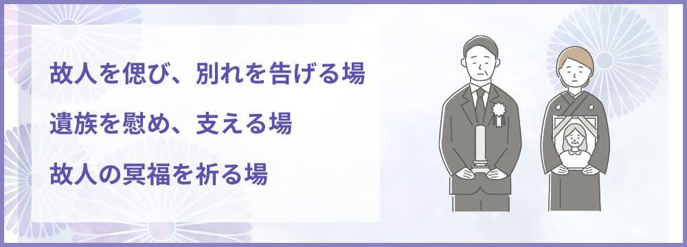 ・故人の冥福を祈る場 : 故人の魂が安らかに眠りにつけるよう、読経や焼香などを通して祈りを捧げる場でもあります。