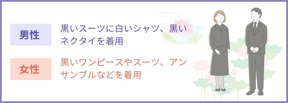 男性は、黒いスーツに白いシャツ、黒いネクタイを着用します。 女性は、黒いワンピースやスーツ、アンサンブルなどを着用します。 派手なアクセサリーやメイクは避け、地味な装いを心がけましょう。