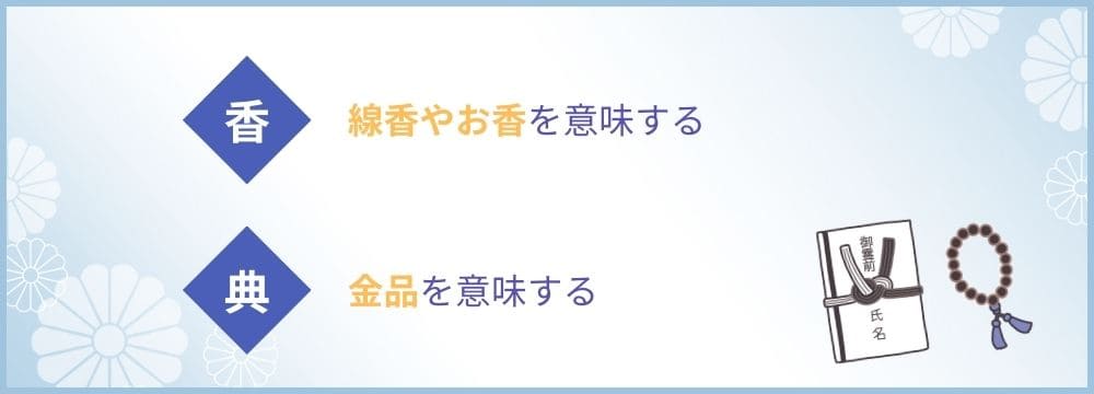 香典の「香」は線香やお香を意味し、「典」は金品を意味します。 かつては弔問客がそれぞれお香を持参して焚き、故人を供養していました。