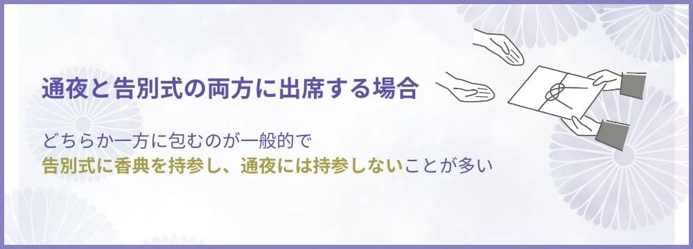 通夜と告別式の両方に出席する場合、香典はどちらか一方に包むのが一般的です。