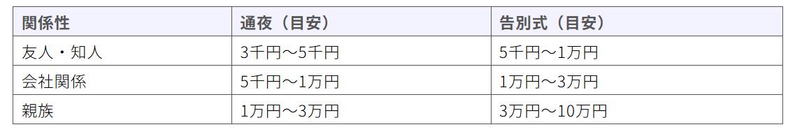通夜と告別式は、故人との関係性によって金額が変わります。一般的に、告別式の方が香典の金額は高くなる傾向があります。
