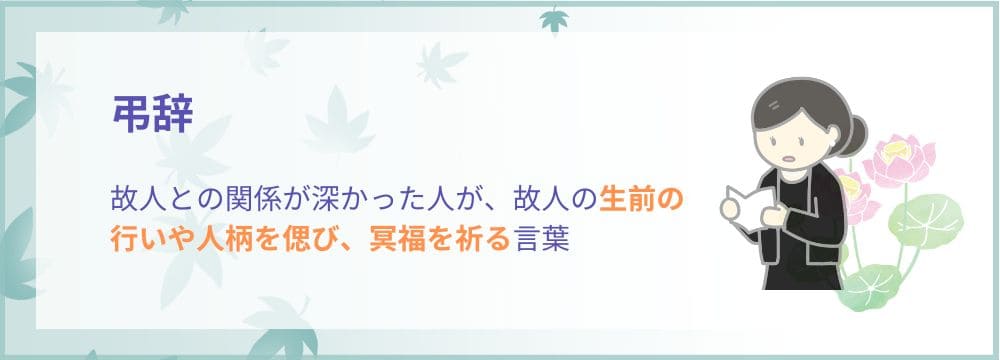 弔辞とは葬儀や告別式にて、故人との関係が深かった人が話す、故人の生前の行いや人柄を偲び冥福を祈る言葉です。 別れの悲しみと感謝の気持ちを込めて、心を込めて読み上げられます。