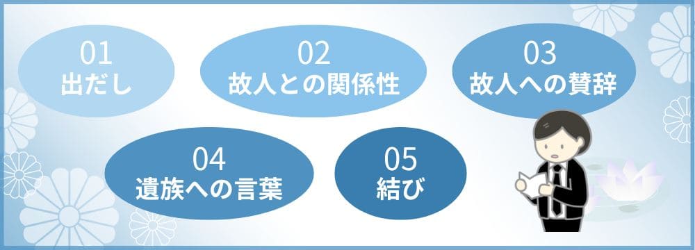 弔辞は、一般的に以下の5つの要素で構成されます。