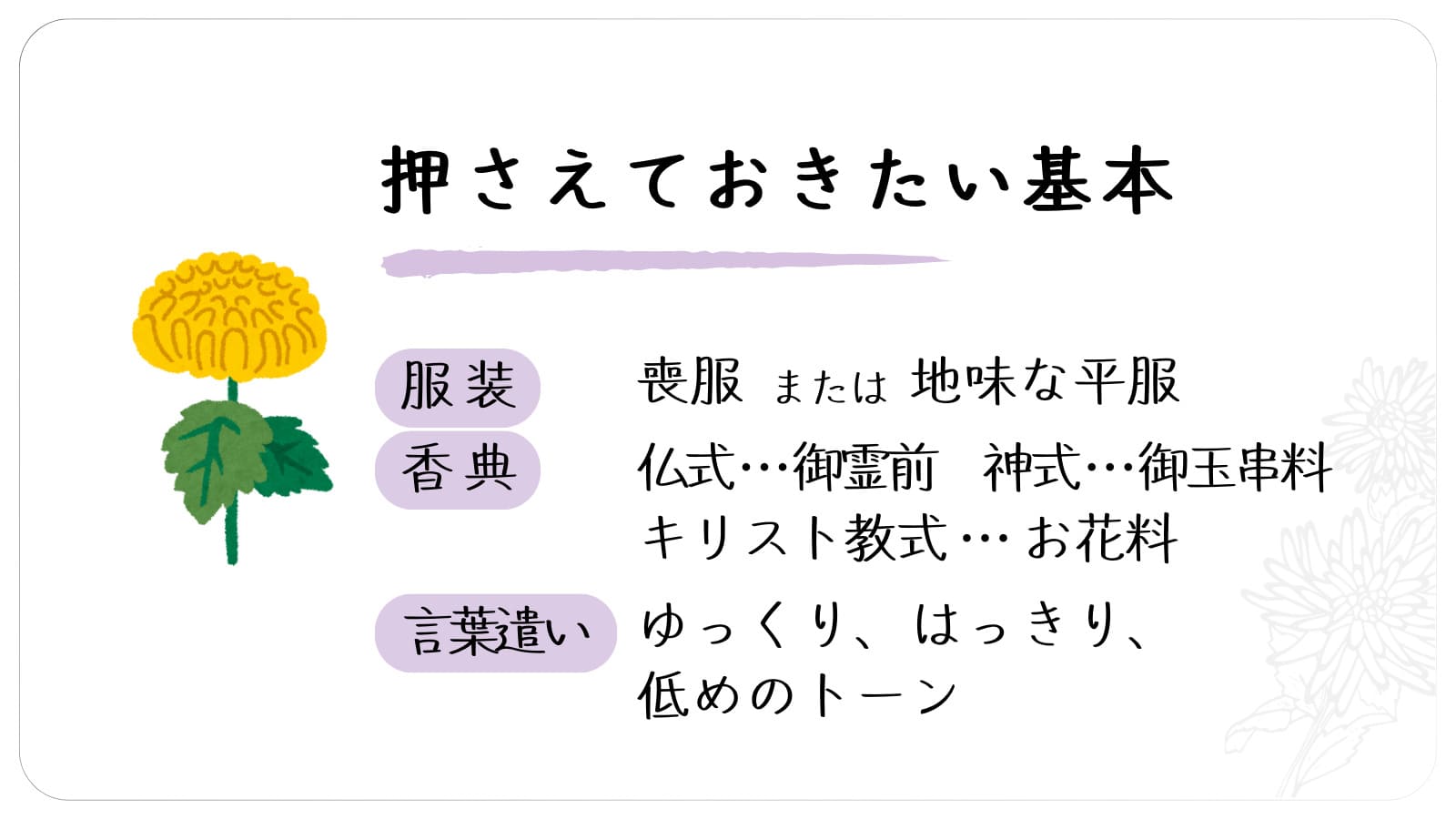・弔問の基本マナー:服装、香典、言葉遣いなど気を使いましょう。