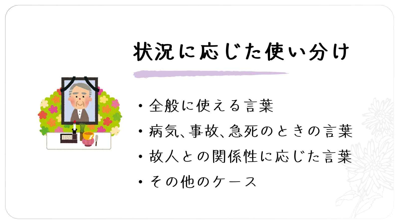 ・お悔やみの言葉:宗教や故人との関係性、状況による使い分けが必要です。