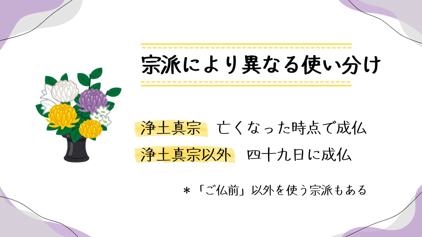 御仏前と御霊前の考え方が異なる宗派があります。