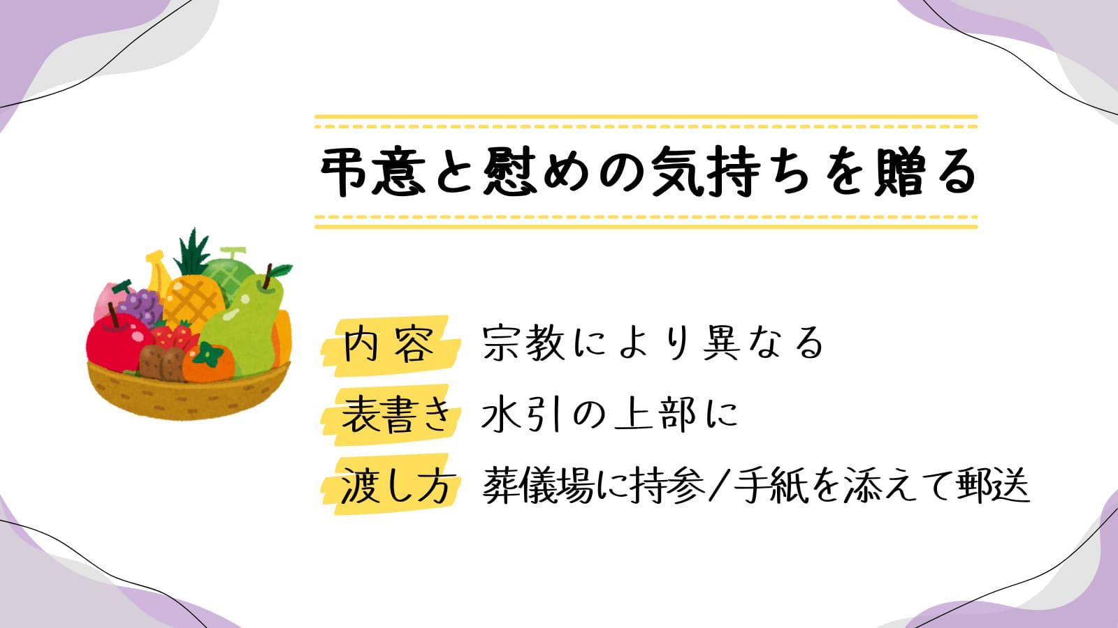 ・宗教・宗派に合ったものを選ぶ : 記を参考に、宗教・宗派に合った供物を贈りましょう。迷った場合は、葬儀社や詳しい人に相談するのがおすすめです。