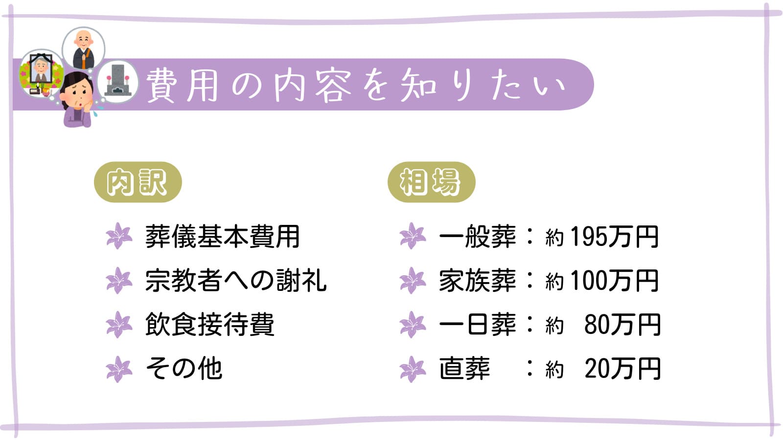 「いくらかかるの?」「何に使うの?」「少しでも出費を抑えたいけど……」そんなあれこれを解消し、後悔のない葬儀を執り行う準備を始めましょう。