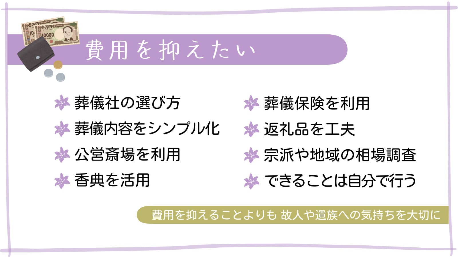 しかし、費用を抑えることを優先しすぎて、故人への想いがないがしろにならないようにしましょう。