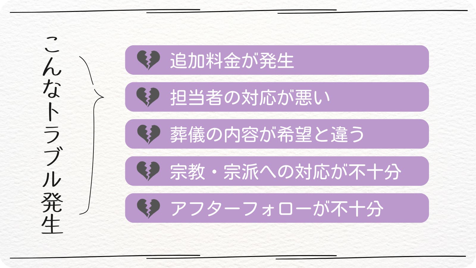 追加料金の発生や担当者の対応の悪さなど、葬儀社選びで起こりやすいトラブル事例を把握して対策をしておくことで、安心して葬儀社を選ぶことができます。