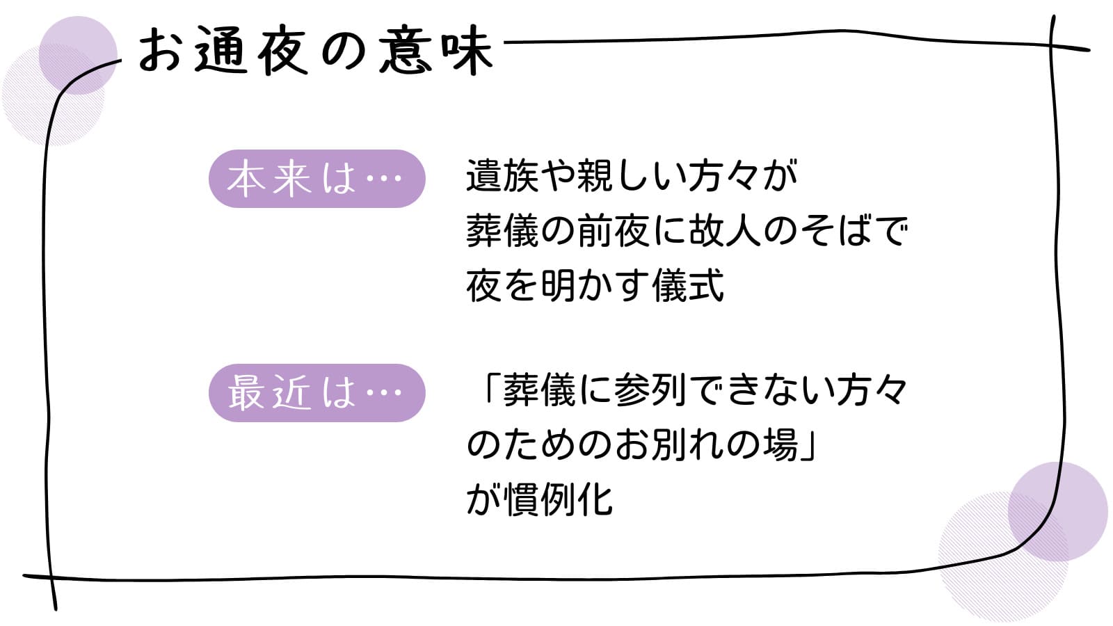 古くからお通夜には、「夜伽(よとぎ)」、「お伽(とぎ)」、「添い寝」といった別名があり、ご遺族や親しい方々が、葬儀の前夜に故人のそばで夜を明かす儀式です。 これは、邪悪なものが故人に近付かぬよう守りながら安らかな旅立ちを祈るとともに、生前の思い出を語り合いゆっくりお別れをする時間です。