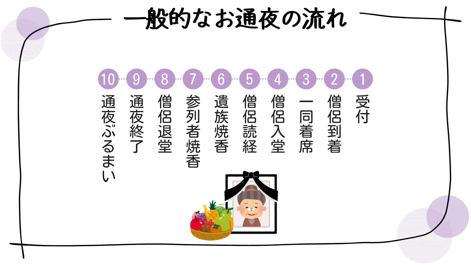 では、一般的なお通夜の流れはどういうもので、どのようなことに注意したらよいのでしょうか。