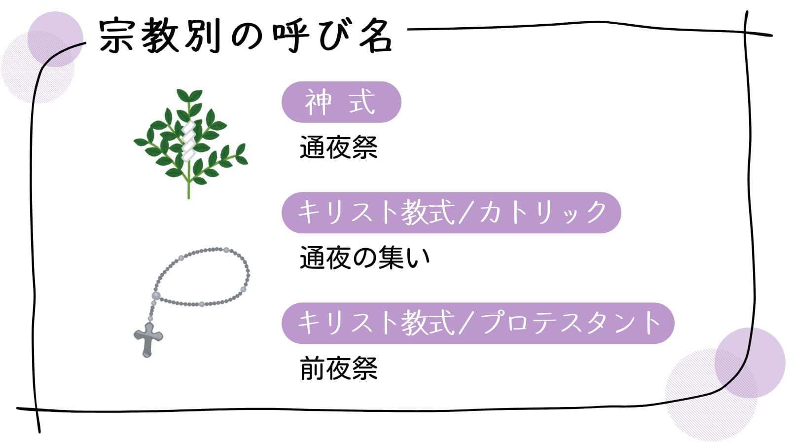 カトリックでは「通夜の集い」、プロテスタントでは「前夜祭」と呼ばれます。