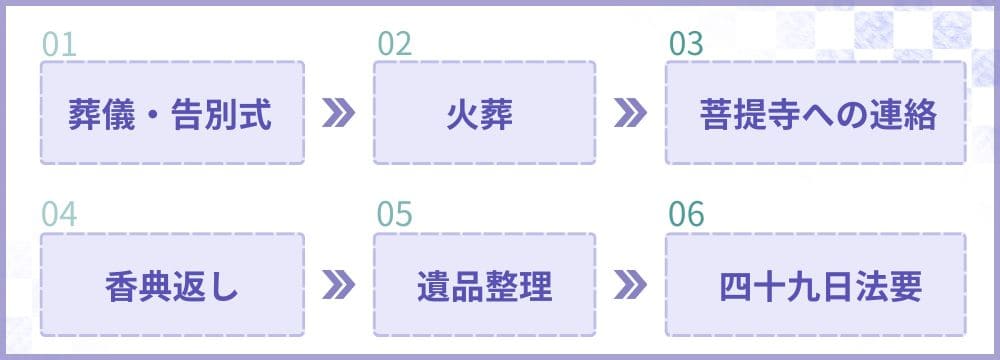 葬儀から四十九日法要までの間には、いくつかの重要な儀式や手続きがあります。ここでは、主なスケジュールと、それぞれの時期に行うことをまとめます。