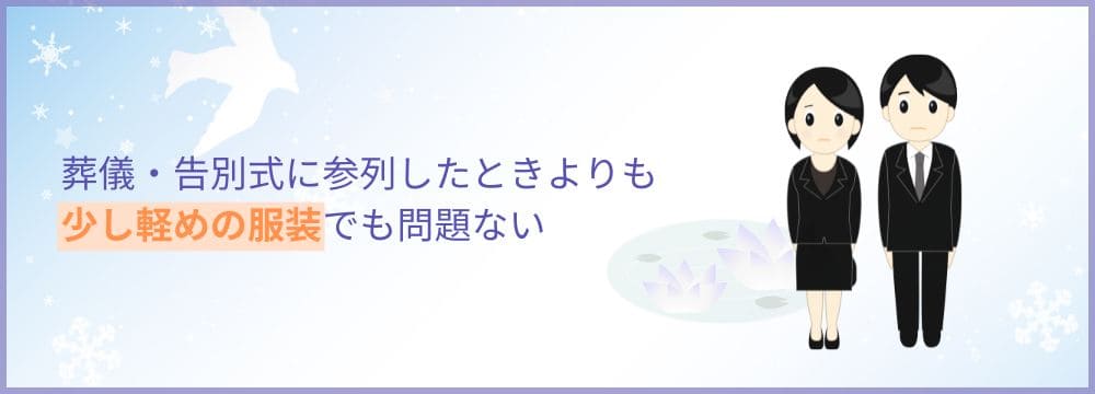 四十九日法要は、喪が明ける儀式でもあります。そのため、服装は葬儀・告別式に参列したときよりも少し軽めの服装でも問題ありません。