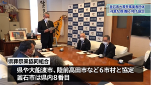 協定は大規模な災害が発生した際に市の要請に基づいて棺や葬儀用品の供給、遺体の搬送や火葬の手配などを円滑に行う内容です。東日本大震災の際、釜石市では組合に所属する葬祭業者が僧侶などと協力して遺体安置所に供養の場を設け犠牲者を弔うとともに遺族に寄り添いました。