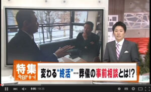 2月25日に放送されましたHBC放送(北海道)の情報番組「今日ドキッ」の「特集 葬儀事前相談」におきまして、「全葬連葬儀事前相談員制度」などが大きく取り上げられました。内容は、全葬連に加盟する北海道の㈱極楽堂はなや(中島浩盟社長)の葬儀事前相談の取り組みについてや、松本勇輝専務理事が全葬連葬儀事前相談員制度などについてインタビューにお応えしております。
