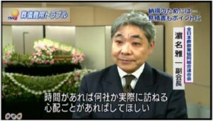 全葬連の濵名雅一副会長は、12月17日放送のNHKニュース番組に出演し、葬儀社選びのポイント、見積書の見方などを説明した上で、「何よりも大切なのは、家族が亡くなる前に葬儀のことについて考え、相談することだ」など話しました。