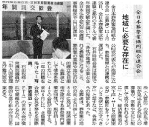 メディア情報新聞、雑誌、テレビなど、メディアに取り上げられた全葬連に関する情報を紹介します。2019.02.03令和元年度以前平成31年2月13日 発行 中外日報中外日報「中外日報」(発行・株式会社中外日報社)2月13日号に、全日本葬祭業協同組合連合会・全日本葬祭業政治連盟合同の新年賀詞交歓会についての記事が掲載されました。 ■中外日報 2月13日号 平成31年2月1日 発行 / ニッポン消費者新聞平成31年2月14日 発行/ 産経新聞出版 終活読本「ソナエ」 2019年新春号メディア情報TOPへ お気軽にご相談ください!理想のご葬儀を実現!葬儀社を探す事前登録でお得に!if共済会 会員登録はこちら