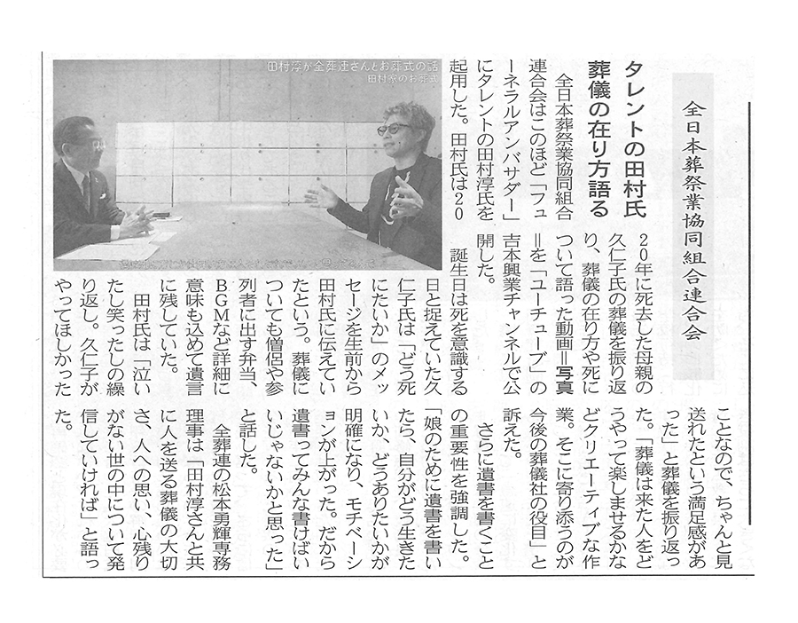 中外日報「中外日報」(発行・中外日報社)6月16日発行に「田村淳さん、全葬連フューネラルアンバサダー就任」についての記事…